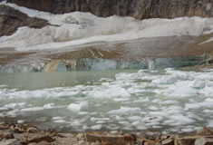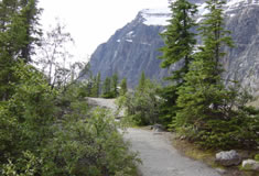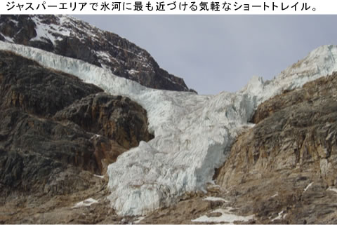 駐車場から正面に聳える山が、第一次世界大戦中に従軍看護婦だったエディス・キャベルの名をとり名づけられた、ジャスパー国立公園の看板マウントエディスキャベル(Mount Edith Cavell:3363m)と天子の羽の形をしたエンジェル氷河。トレイルを500m進んだところに分岐があり右にキャベルグレイシャー、左にキャベルメドウと別れるが、花が咲いている時期7月から8月中旬までならキャベルメドウがお勧めだが、それ以外ならキャベルグレイシャーを間近に見れる右ラインが気軽でお勧め。キャベル氷河は100年前までは駐車場まできていたようだが今では後退して現在の位置に至る。